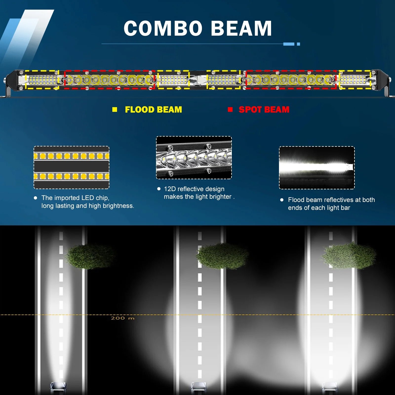 Super Bright Combo Beam: Each slim light bar comes with 52PCS 3W high-intensity LED chips total 156W, providing a powerful output of 6500K super bright pure white light. Spot and flood reflector combo, 170° flood and 30° spot combined beam allows for longer lighting distance and brightness and a wide range of illumination. Make sure to see the road clearly and drive safely at night.