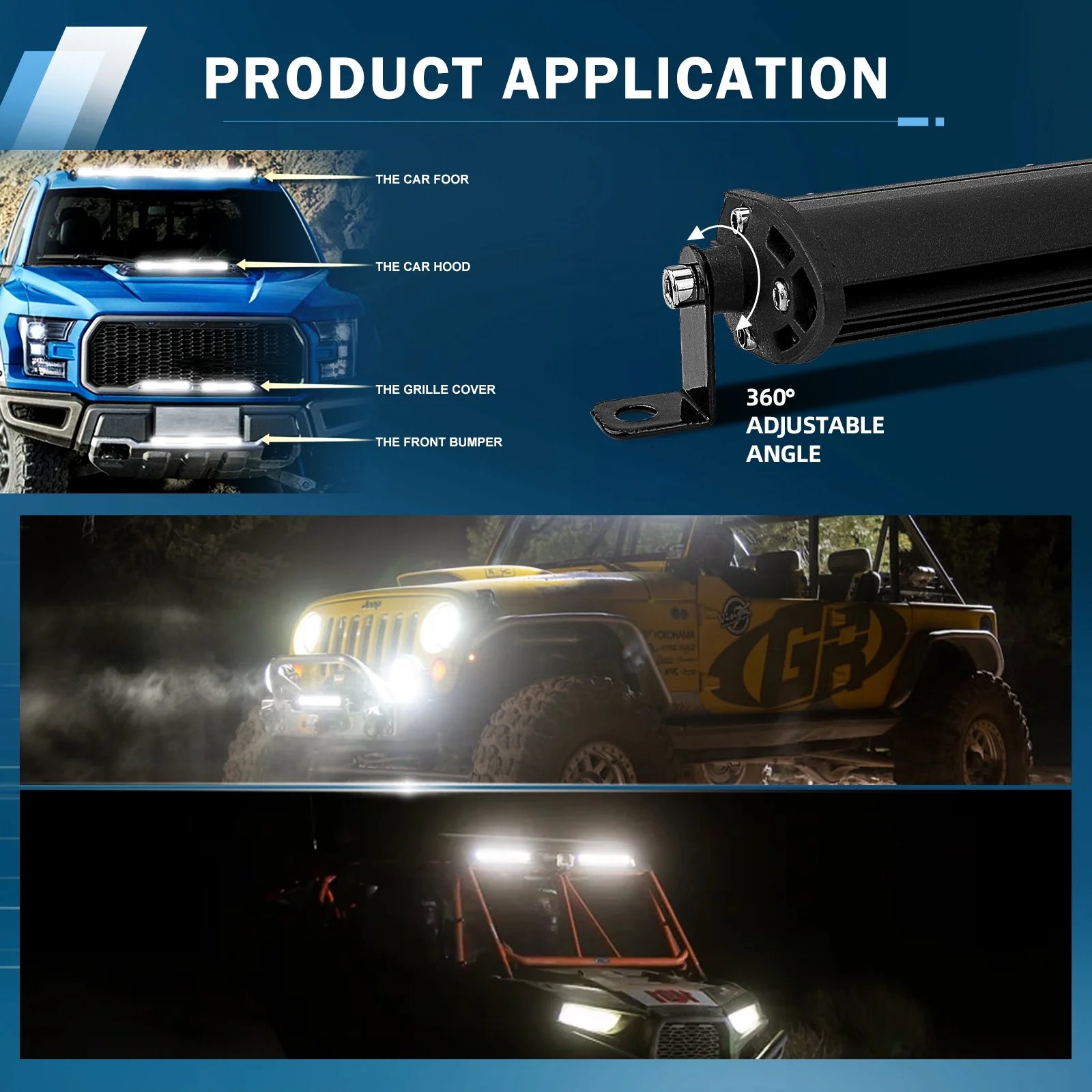 Adjustable Mounting Brackets: Each slim light bar comes with adjustable mounting bracket that allows you to 360° adjust the mounting angle of the light to achieve the best lighting effect you need.